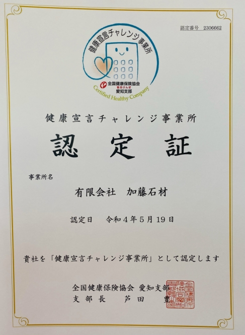 2022年05月26日 お知らせ 健康宣言チャレンジ事業所認定証を頂きました この度、スミカは「健康宣言チャレンジ事業所」として認定を頂く事ができました。 入居者様・職員様が毎日健康で、すこやかに過ごしていける様な施設運営に励んでまいります。 お知らせ一覧へ戻る