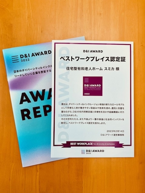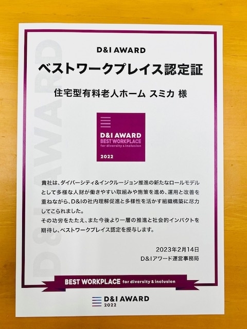 2023年04月24日 お知らせ 「D&I AWARD ベストワークプレイス認定証」を頂きました この度、スミカは、「D&I AWARD ベストワークプレイス認定証」を頂くことができました。 D&Iアワードはダイバーシティ&インクルージョンに取り組む企業を認定・表彰する日本最大のアワードです。 弊社はこれからも、一人ひとりの個性や違いが障壁とならないような職場作りを目指しつつ、誰もが生きやすい社会の発展に貢献できるよう努力して参ります。 お知らせ一覧へ戻る